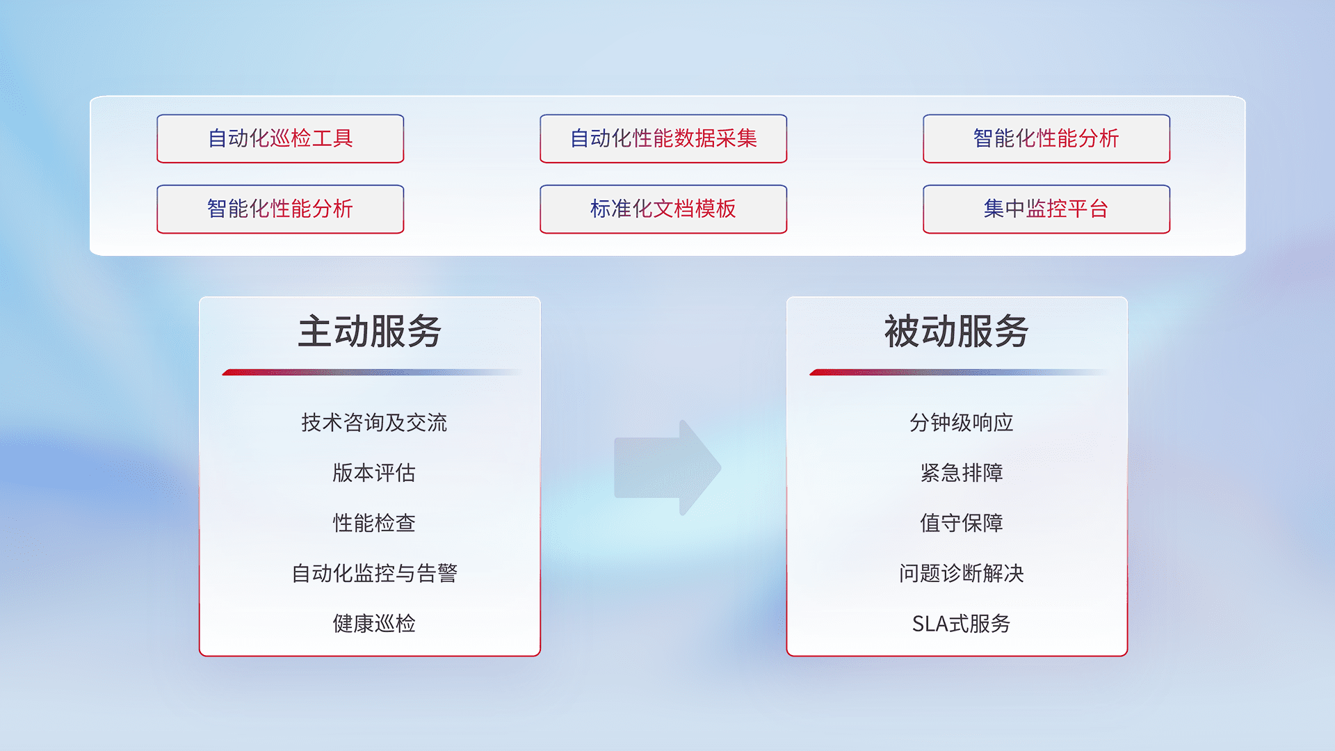 智能化工具和标准化文档,,,,保障服务质量,,,提供主动服务(包含技术咨询、、版本评估、、性能检查、、、、自动化监控与告警、、、健康巡检)和被动服务包含(分钟级响应、、、紧急排障、、、、值守保障、、、、问题诊断解决、、、、SLA服务)。。。。